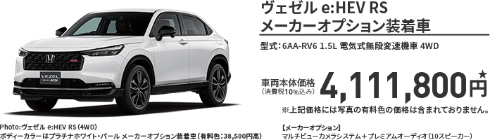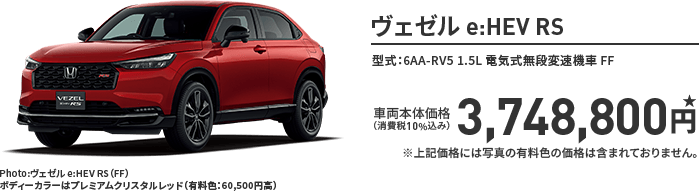 Photo:[1]ヴェゼル e:HEV RS(4WD) 車両本体価格(消費税10%込み)3,968,800円★ 価格には写真の有料色及びメーカーオプションの価格は含まれておりません。ボディーカラーはプレミアムクリスタルレッド・メタリック(有料色:60,500円高)メーカーオプションマルチビューカメラシステム+プレミアムオーディオ:143,000円高)装着車[2]ヴェゼル e:HEV RS(FF) 車両本体価格(消費税10%込み)3,748,800円★ 価格には写真の有料色の価格は含まれておりません。 ボディーカラーはプレミアムクリスタルレッド・メタリック(有料色:60,500円高)※すべての立体駐車場に入庫可能とは限りません。また車両の状態により、表示上では入庫可能な駐車場でも、車高検知センサーによる警告や車高制限バーへの干渉で入庫できない場合などがあります。入庫の際には必ずご確認ください。■イラストは機能説明のためのイメージ図です。[3][4]ヴェゼル e:HEV RS(FF) 車両本体価格(消費税10%込み)3,748,800円★